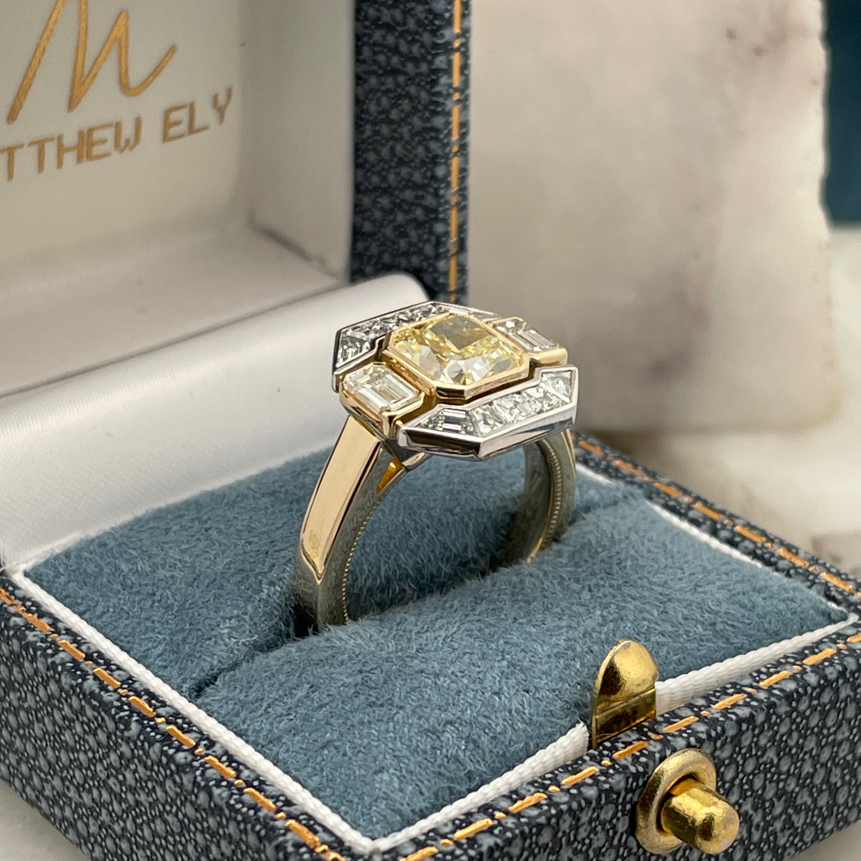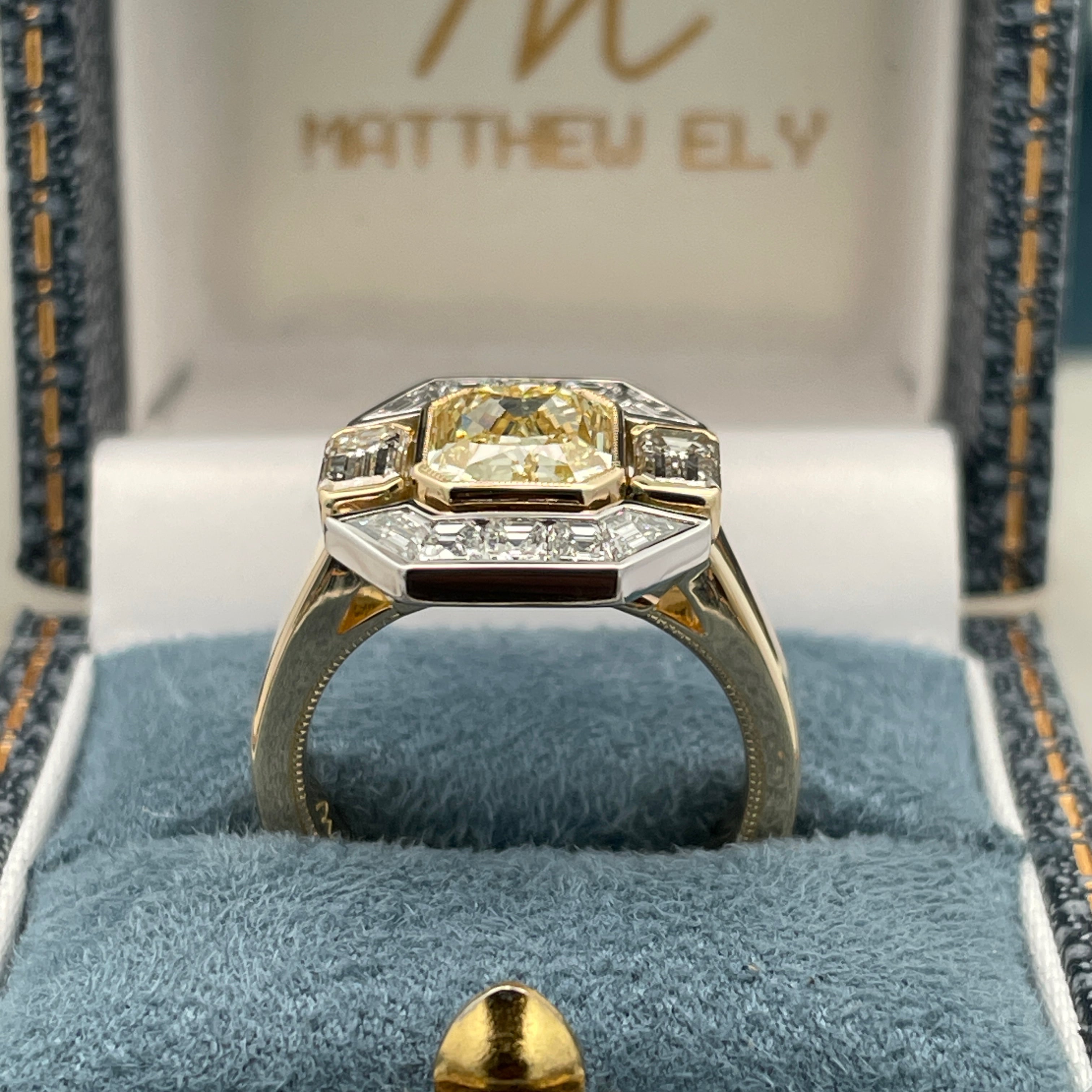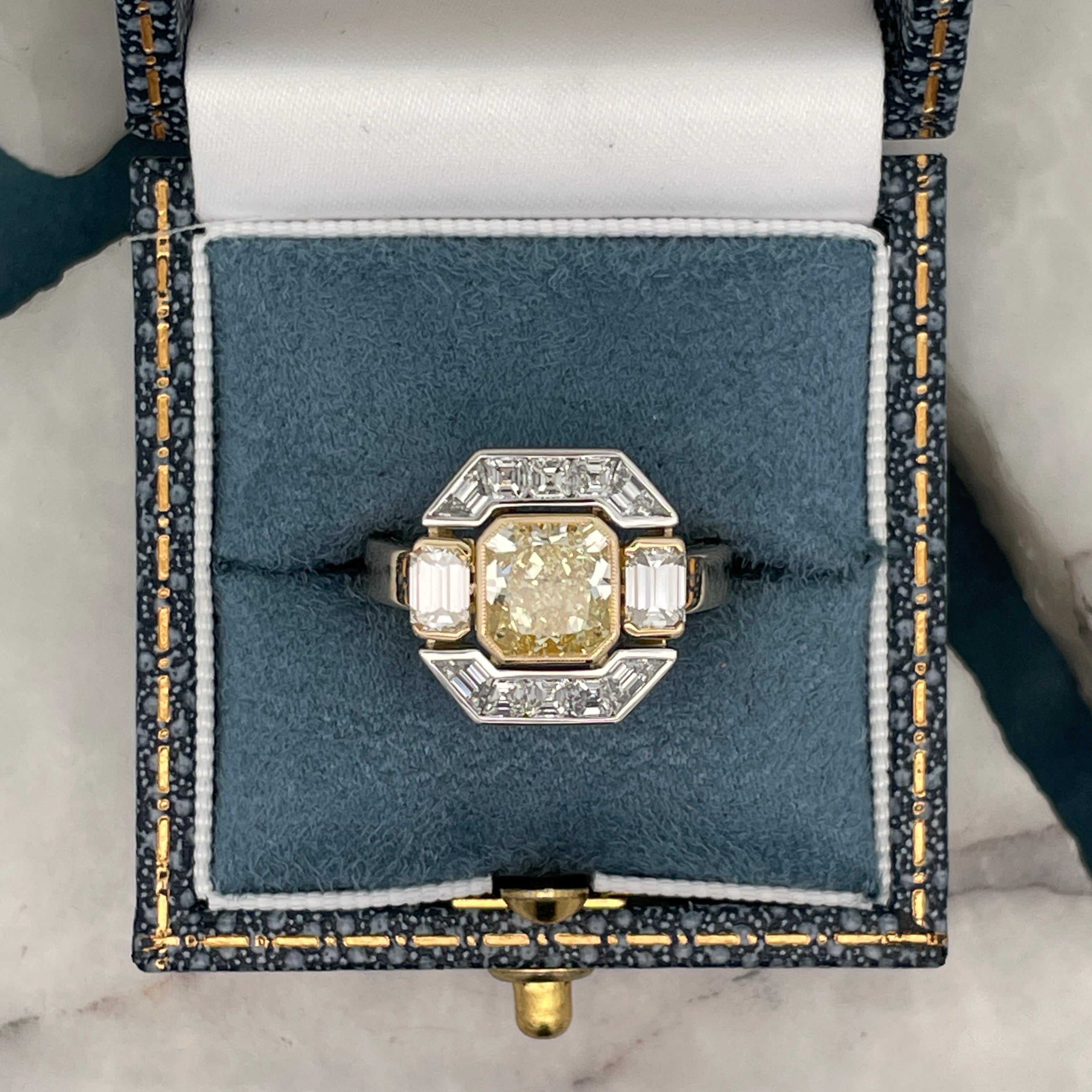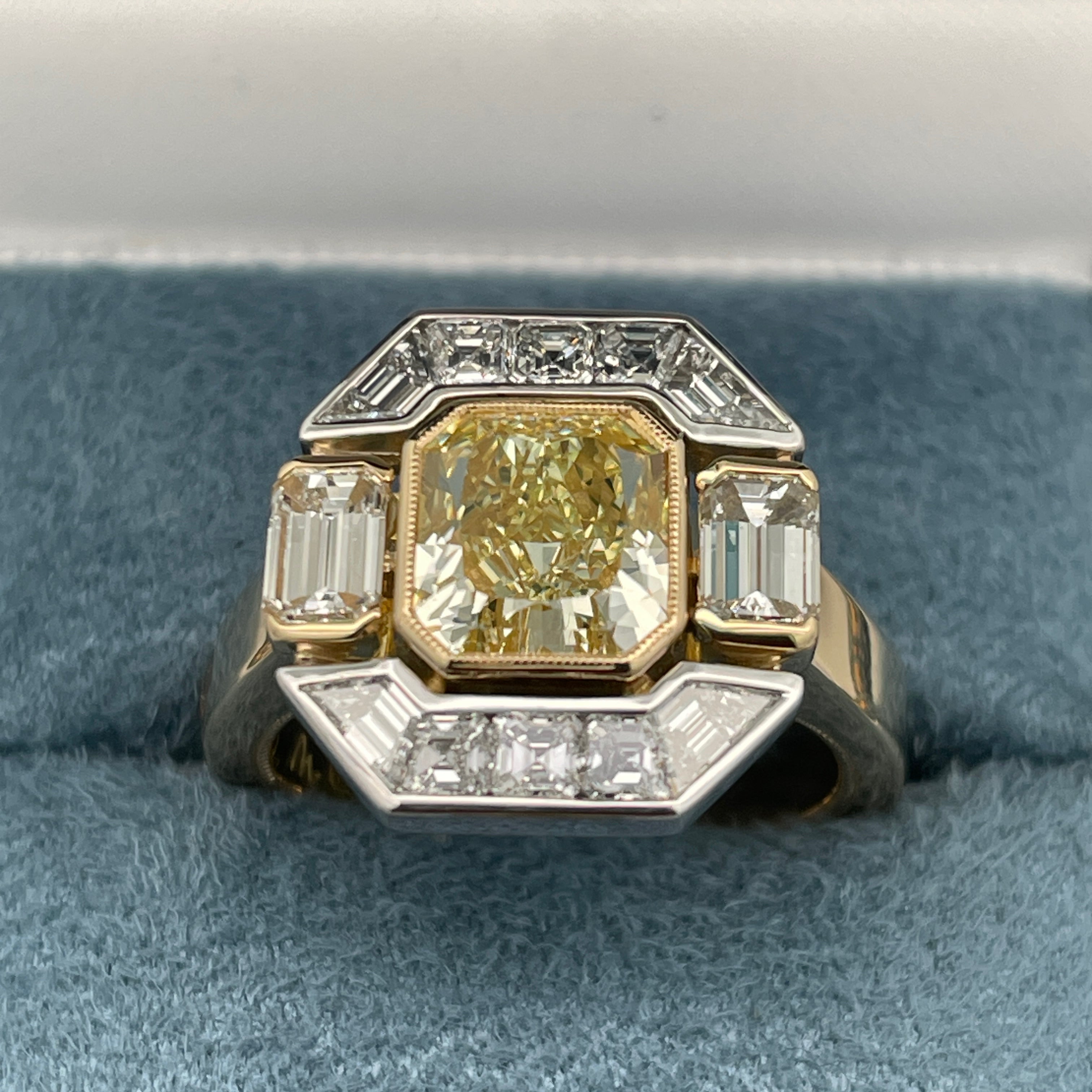 Meticulously handcrafted in 18ct yellow and white gold, this bespoke ring is a redesign of our client’s original yellow diamond ring, centred around a 2.16ct yellow diamond.
