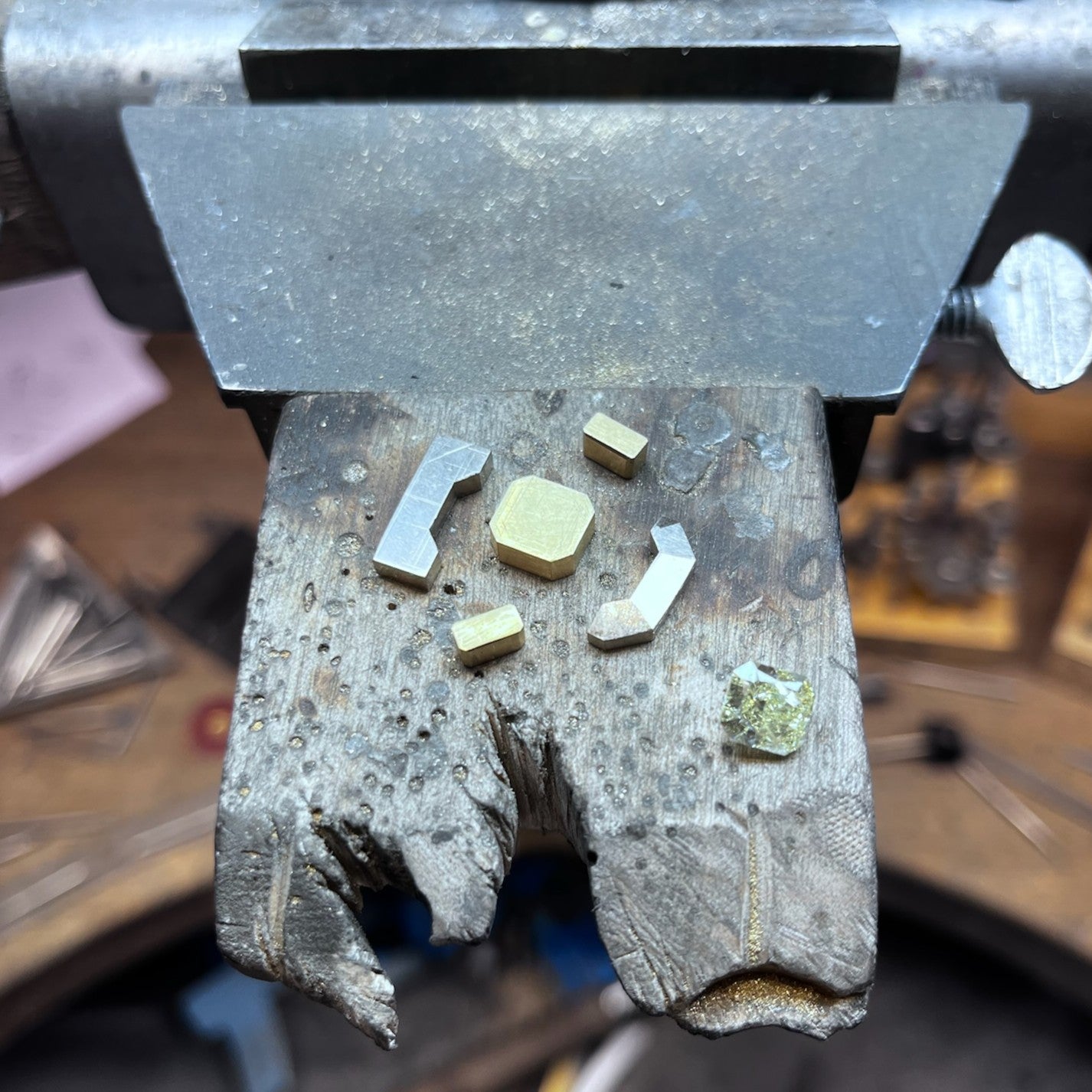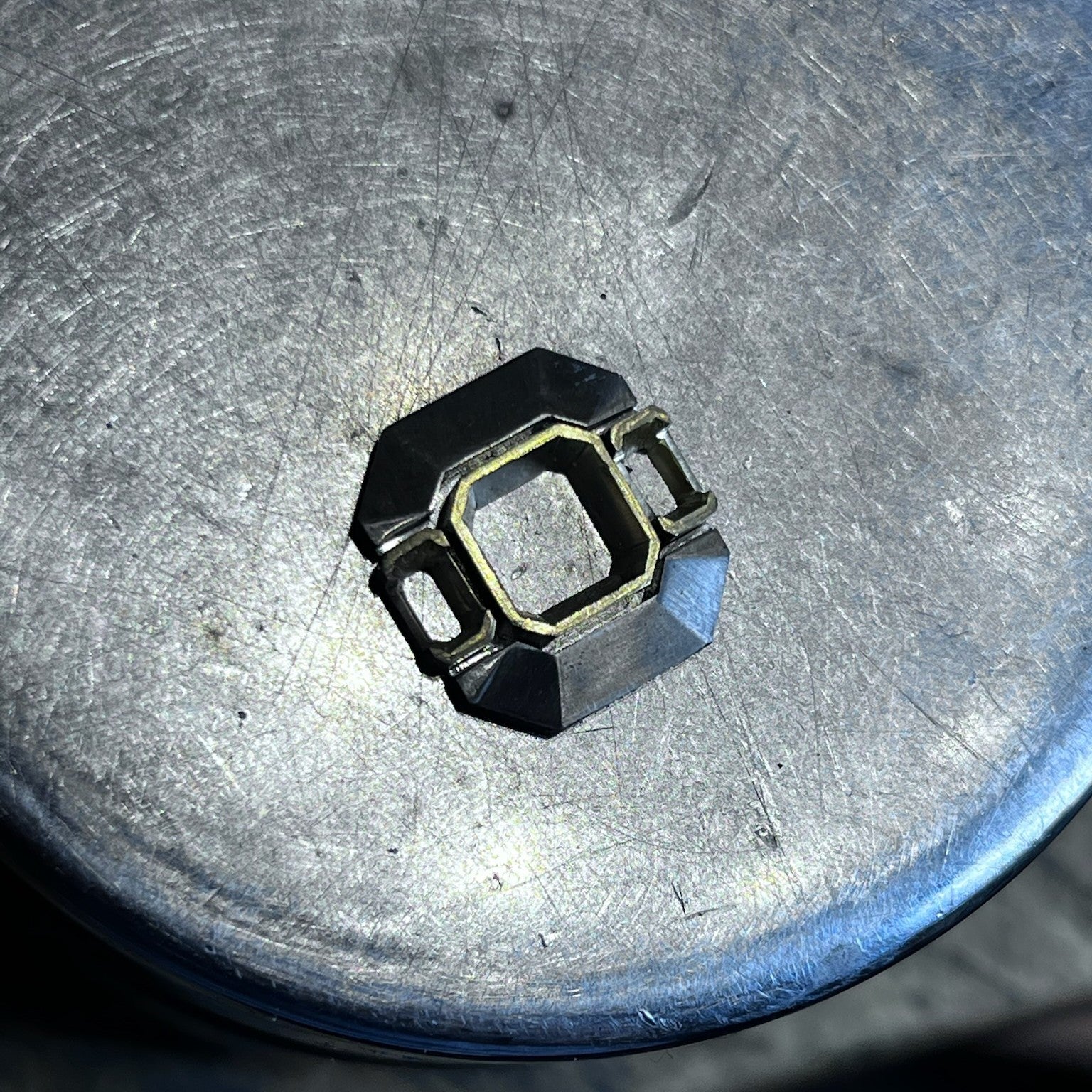 The centre stone is bezel set in yellow gold and framed by a structured halo, with the outer halves of the halo crafted in white gold. The halo features four custom baguette-cut diamonds and six Asscher-cut diamonds, with deliberate daylight introduced between the halo and the centre setting.