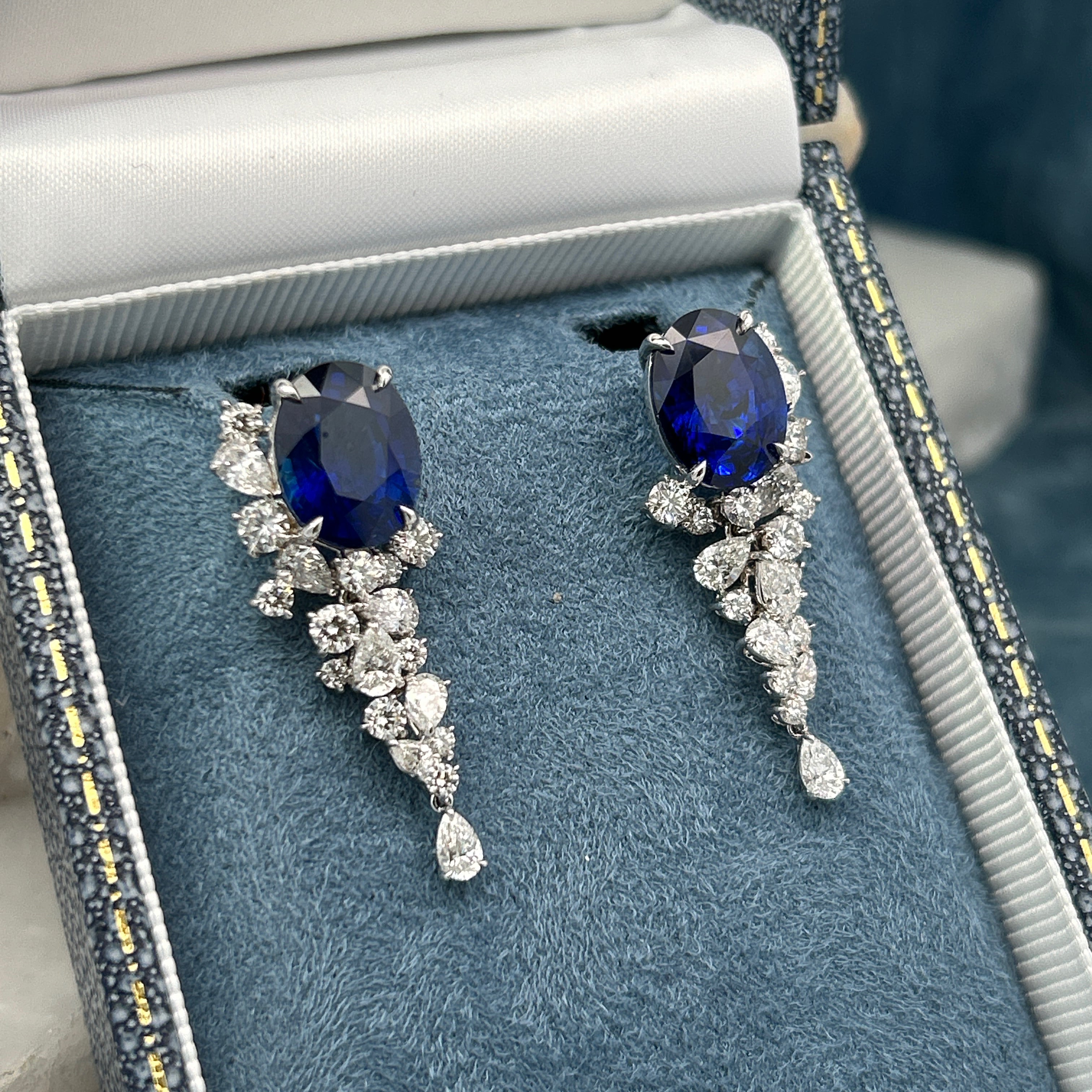 These 18ct white gold earrings are set with two striking Sri Lankan sapphires, with a combined weight of 9.64ct. Their vivid blue hue is enhanced by a refined arrangement of diamonds: pear-shaped gemstones totalling 1.56ct, and round brilliant cuts totalling 1.18ct, all graded F/VS for exceptional quality.