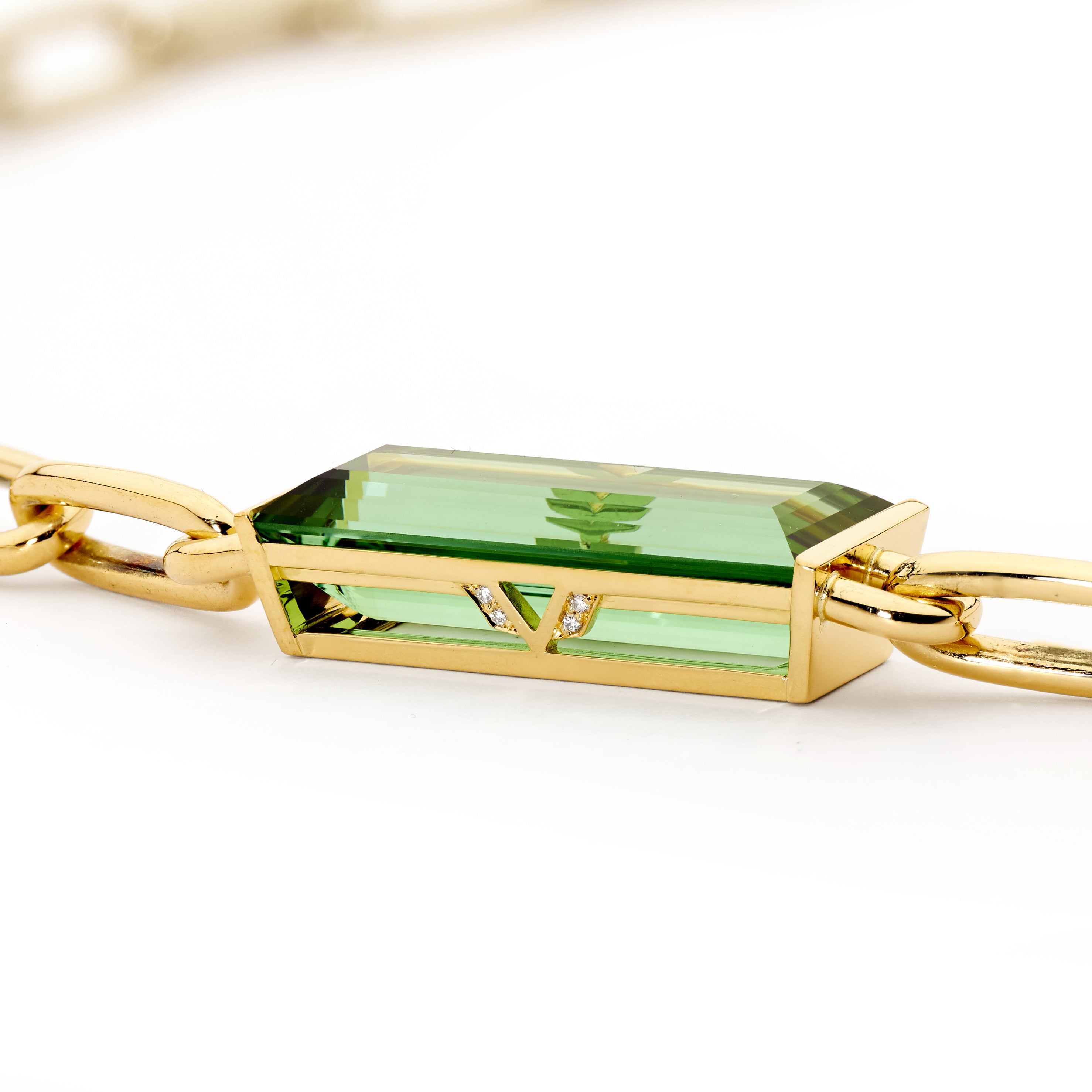 This 18ct yellow gold paperclip necklace features a striking baguette-cut green tourmaline, weighing 20.32ct. The elongated cut highlights the gem’s vivid colour and clarity, enhanced by the precision of its end-set design.